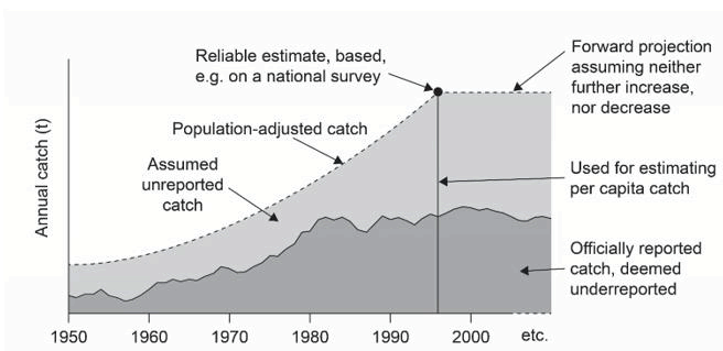 An alternative approach to estimating freshwater fisheries catches is proposed here, whereby independent point estimates of catches are divided by national population estimates for the respective year to obtain a population estimate-derived point estimate of per capita freshwater fish consumption, which is assumed to remain largely constant through time and is multiplied by the national population estimates from preceding years to develop a (rough) backward catch projection to 1950.