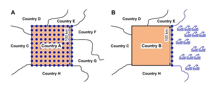 Figure 2. Contrasting the inland and marine fisheries monitoring systems (i.e., blue dots, representing, e.g., personnel) of small hypothetical African countries (one landlocked and the other coastal) to demonstrate the impact of dimensionality on fisheries operations. A) Schematic representation of the inland fisheries monitoring system of a landlocked country; i.e., Country A, surrounded by countries C to H. Inland fisheries have the potential to operate all across the country's surface and are thus represented as 10 × 10 dots evenly distributed 10 km apart across the entire 10,000 km2 surface area. B) Schematic representation of the marine fisheries monitoring system of a coastal country; i.e., Country B, surrounded by countries C, D, E and H, with countries F and G replaced by a coastline. Marine fisheries landings need to be monitored only along a one-dimensional coastline, which, in this example, requires 10 times less personnel to achieve the same degree of monitoring intensity as for Country A.