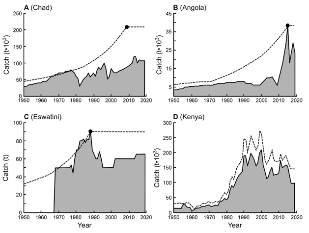 Figure 3. Four representative examples of the tentative catch reconstructions developed in this study, with A) Chad (reliability score=3) illustrating the ‘one-point+population’ approach; B) Angola (reliability score=3) and C) Eswatini (reliability score=2) illustrating the ‘FAO catch+population’ approach; and D) Kenya (reliability score=4) illustrating the comprehensive catch reconstruction performed by Schubert et al. (2022).