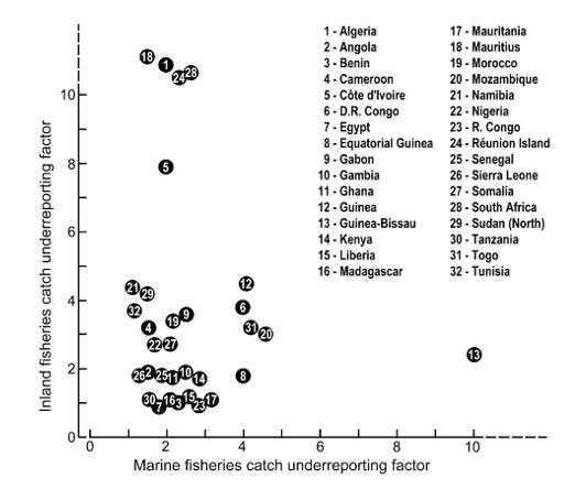 The comparison of fisheries catch underreporting factors presented in Figure 5 suggests that, generally, marine fisheries catches are better documented by Africa’s 32 maritime countries with both marine and inland fisheries than are their freshwater fisheries catches, possibly for the reason illustrated in Figure 2.