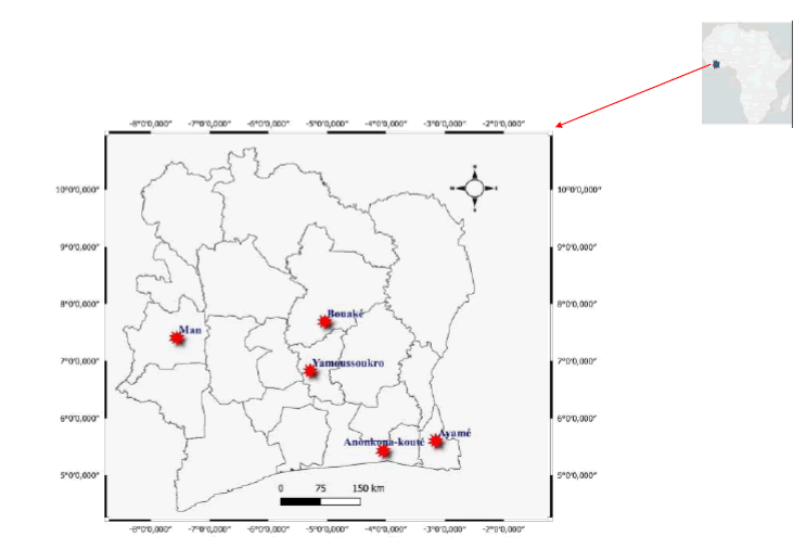 The studies were conducted in five localities distributed across three regions, each with distinct ecological and geographical contexts. In the south, we had Anonkoua-Koute and Ayame; in the west, Man; and in the central region, Bouaké and Yamoussoukro. Anonkoua-Kouté (5°25'55.90" N; 4°02'45.27" W)is a peri-urban village located in the Abobo-Nord healthdistrict in Abidjan. The village experiences annual precipitationexceeding 1700 mm and temperatures ranging from 27°C to33°C. A community-based urban health facility (FSUCOM)serves an estimated population of 61,250 inhabitants as of2008.