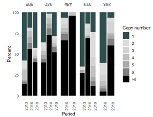 | Copy number | ANK | AYM | MAN | BKE | YMK | chi-square | p-value |