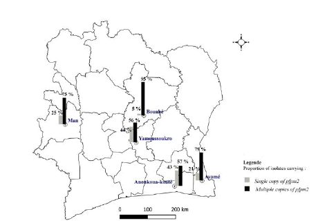 Despite these regional disparities, no significant difference was observed in the average proportions of isolates carrying multiple copies of the pfpm2 gene (Chi-square=4.0421; df=2; p-value=0.1325). The results of the geographical distributionanalysis, both at the site and regional levels, highlight apronounced predominance of alleles with multiple copies, witha scarcity of the single-copy allele in Bouake [3].