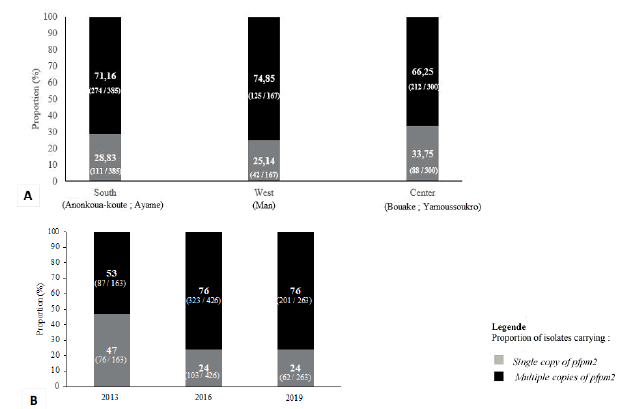 Conclusion: Overall, the study sites revealed proportions of isolates carrying multiple copies of the pfpm2 gene exceeding 50% during the period from 2013 to 2019, with a significant decrease in Man and a significant increase in Yamoussoukro. Prior evaluation would have been opportune before the deployment of the DHA-PPQ combination.