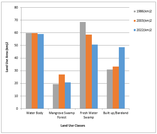From Table 2, the 17-year period of 1986 to 2003, shows a 0.047 sq.km decrease in Open Water, which represents about 0.235 percent of the total change at the rate of 0.0028 sq.km per year. This landuse showed further decrease by 2.194 percent for the period of 2003 to 2022. Also observed for the 36 year- period, there was a 1.17% decrease in open water with a 0.017 sq.km annual rate of change. This means that, the landuse steadily decreased as a result of building expansion and population increase. For the Mangrove swamp forest, the study revealed an increase of 7.567 sq.km, representing 37.85% change between 1986 and 2003. Also, between 2003 and 2022 change period, the mangrove forest further decreased by 20.98%. The overall 36 years showed a 2.413% increase in the mangrove swamp forest with annual rate of change as 0.035 sq.km, the 17 years’ period showed the area received little or marginal change in the cover. This is attributable to a momentary wave of community efforts of reforestation which had since been discontinued due to further pressure from the community. However, the 19-year period which showed massive reduction which implies that, the decrease in the swamp forest results from continuous deforestation of the area, intensification of farming and rural development.