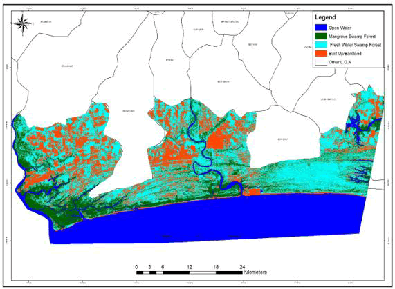 An unsupervised classification was adopted in the study. However, reference was made to the landuse and vegetation classification scheme of the CRBDA which the authority used when mapping the area in 1987. For the purpose of this study, the scheme was simplified into four land cover classes. These are; open water, mangrove swamp forest, fresh water swamp forest and built up area.