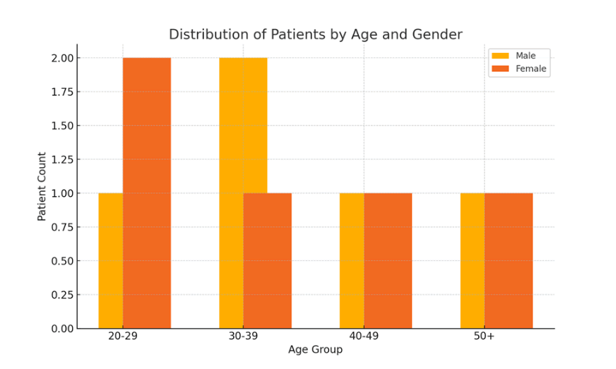 Sex distribution The pie chart reveals a fairly balanced distribution of sex among the patients, with 55% being female (6 patients) and 45% male (5 patients). This suggests that ureterocele affects both genders almost equally in the adult population treated at Mamata Medical College (Figure 2).